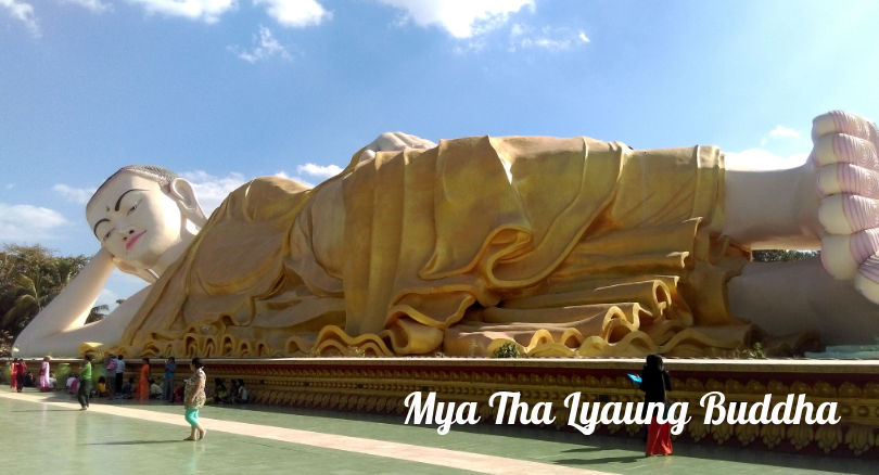 3.30 PM. Mya Tha Lyaung Buddha is a reclining statue located west of Bago City (Pegu), Burma (Myanmar). The statue is 82 meters (270 feet) long, making it an enormous outdoor statue in Myanmar, just behind the Shwethalyaung Statue.